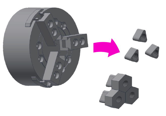 生爪先端部が分離している為、本体はチャックにつけたまま、アタッチメントを本体へボルトで締めて取り付けるだけ。