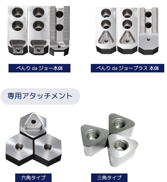 生爪の先端部をアタッチメント化した「べんりdaジョー」は、NC旋盤用生爪の画期的な商品です。チャッキング装置に着目し、実用性を重視して開発されました。アタッチメント部の取替だけで使用可能なため、段取り時間の短縮や保管スペースの縮小、そしてコスト削減が実現できます。これ一つで、作業効率が飛躍的に向上します。